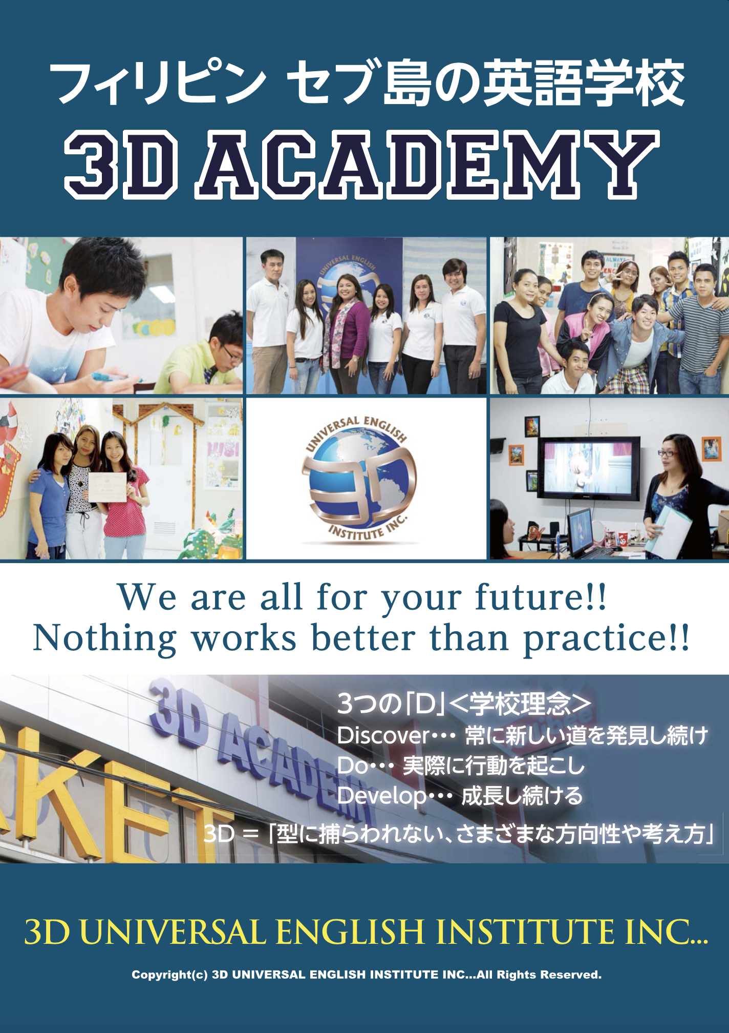 3D ACADEMYではスピーキングを重視した「実践英会話学習」を提供しており、生徒それぞれの目的に合わせたカリキュラムが用意されています。1日8コママンツーマンのみのコースから、海外大学進学を目指すコース、2カ国留学をしたい方向けのコースなどさまざまなカリキュラムが提供されています。