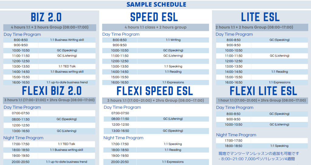 マンツーマンレッスン1日3コマ、グループクラス1日2コマ