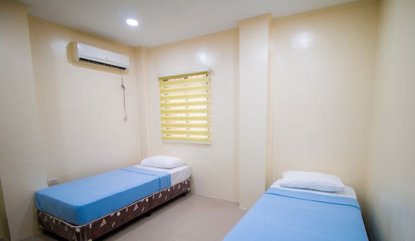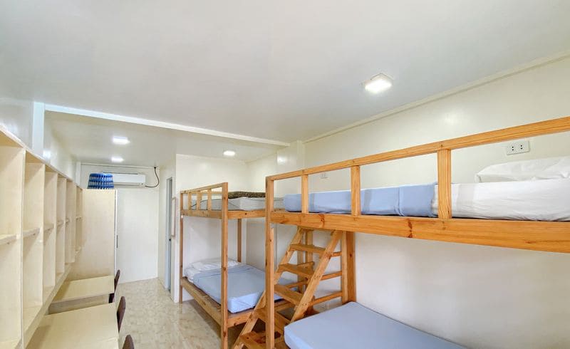 部屋は1人から4人部屋の4タイプがあり、机、イス、ベッド、エアコン、鏡などがどの部屋にもついています。トイレとシャワーは同じ場所にあるユニットバスですが、全ての部屋に付いています。3つの部屋ごとに冷蔵庫とWi-Fiもついています。