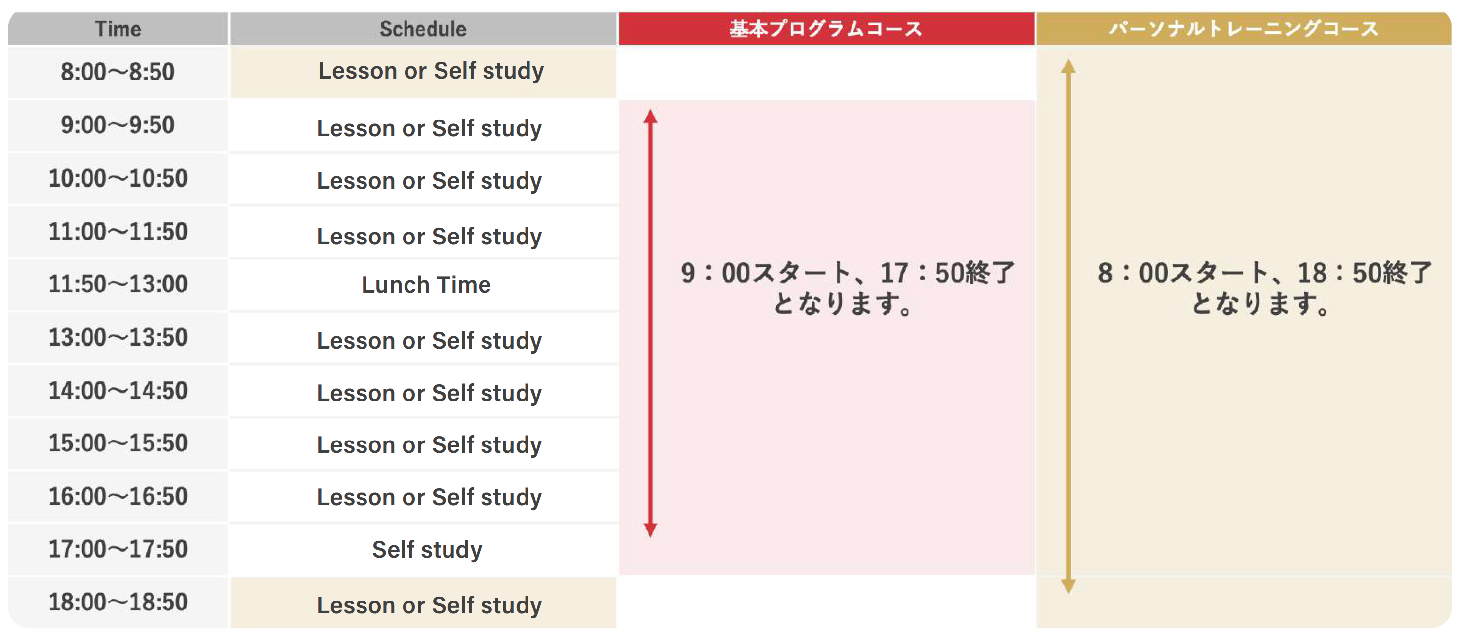• 基本料金に含まれるもの:授業料、宿舎代、テキスト代、朝食代、施設内インターネット、ジム利用料、トレーナー面談